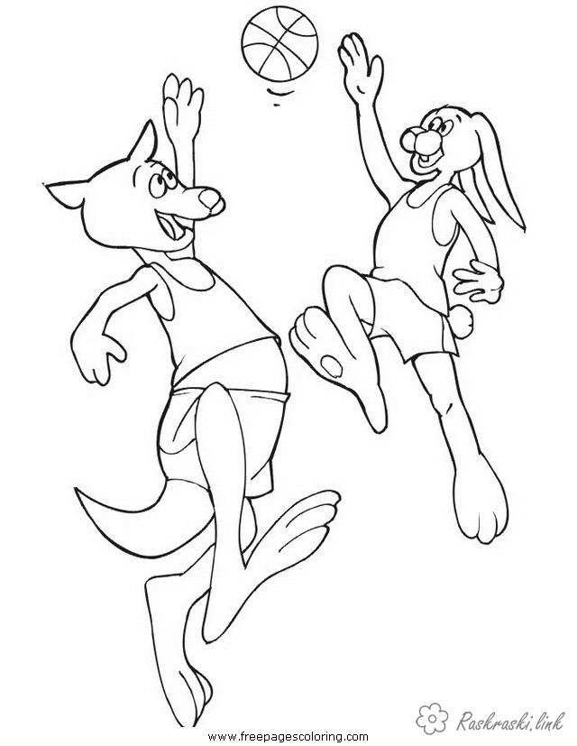 заєць і лисеня грають баскетбол. Раскраска заєць, баскетбол, тварини, спорт завантажити бесплатно онлайн