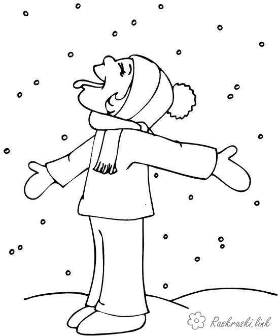 Хлопчик ловить сніжинки мовою. Раскраска розмальовки для дітей, явища природи, природа, сніг, хлопчик завантажити бесплатно онлайн