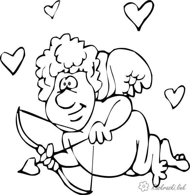 Амур. Раскраска Купідон, стріли, лук, серце. завантажити бесплатно онлайн