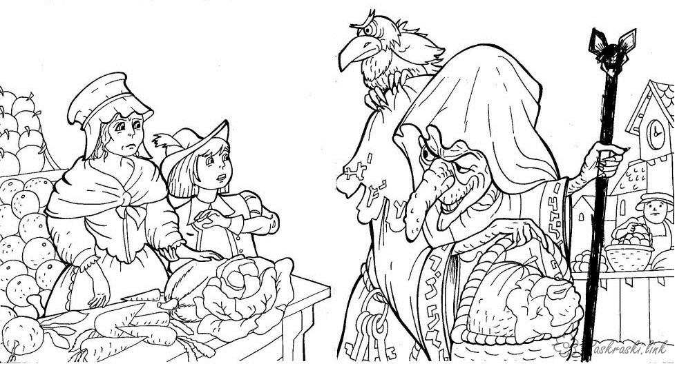 Злісна стара лякає дітей на базарі. Раскраска карлик ніс, розфарбування, мультфільм, Гауф, базар, стара, прилавок, капуста, мама, хлопчик завантажити бесплатно онлайн