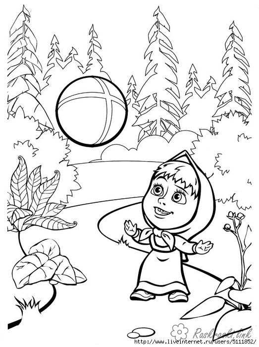 маша грає в м'ячик. Раскраска розмальовки, маша и медведь, м'яч, природа завантажити бесплатно онлайн