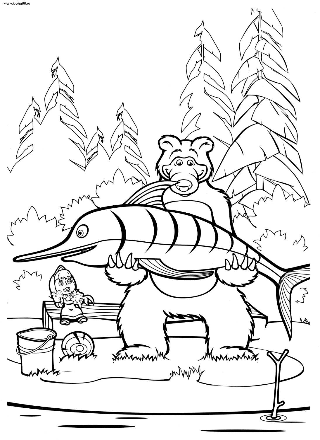 маша і миша спіймали рибу. Раскраска розфарбування для дітей, маша и медведь, велика риба завантажити бесплатно онлайн