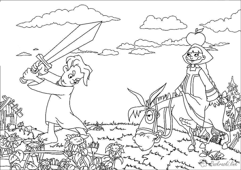 маленький Альоша відточує майстерність. Раскраска Альоша Попович і Тугарин Змій, Любава, Альоша, меч, яблуко, ослик, соняшники, літо завантажити бесплатно онлайн