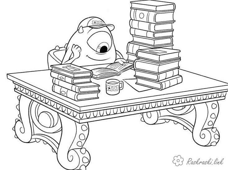 Розмальовка Майкл вчиться. Раскраска Університет монстрів, монстр, Майкл, вазівська, книги, стіл, навчання завантажити бесплатно онлайн