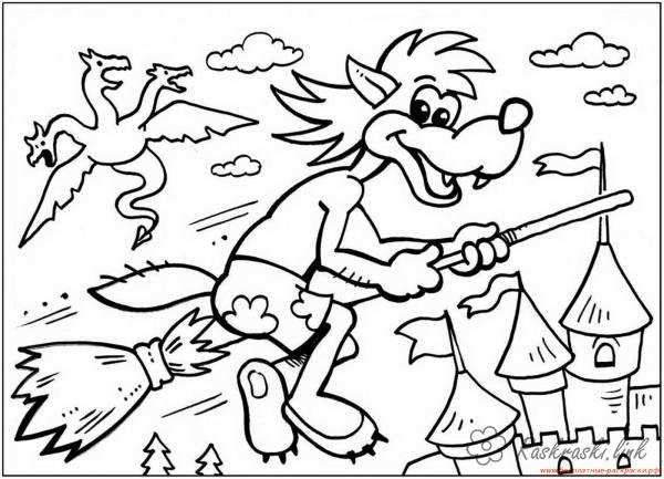 вовк летить на мітлі. Раскраска розфарбування для дітей, ну погоди, вовк на мітлі завантажити бесплатно онлайн
