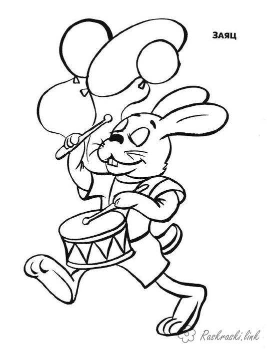заєць грає на барабані. Раскраска розфарбування заєць, барабан, для дітей завантажити бесплатно онлайн