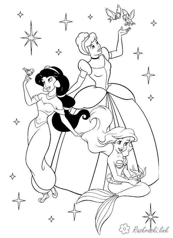 Принцеси. Раскраска жасмин, попелюшка, Аріель, дисней, розмальовки завантажити бесплатно онлайн