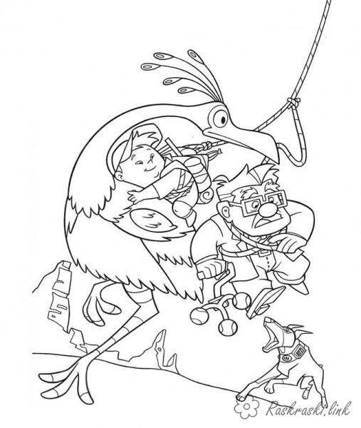 Карл Фредріксен і Рассел тікають від собаки. Раскраска розмальовки мультфільми, розмальовки мультфільм вгору, дідусь, хлопчик, Карл Фредріксен, Рассел, птиця, собака завантажити бесплатно онлайн