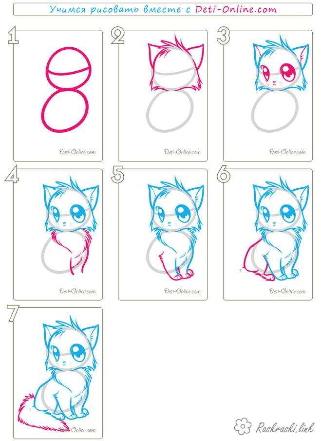 нарисовать поэтапно кошечку. Раскраска кошечка, этапы, рисовать завантажити бесплатно онлайн