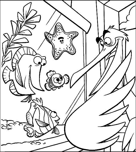Немо і пелікан. Раскраска розмальовки мультфільми, розмальовки в пошуках немо, Немо, птиця, рибки, морська зірка завантажити бесплатно онлайн