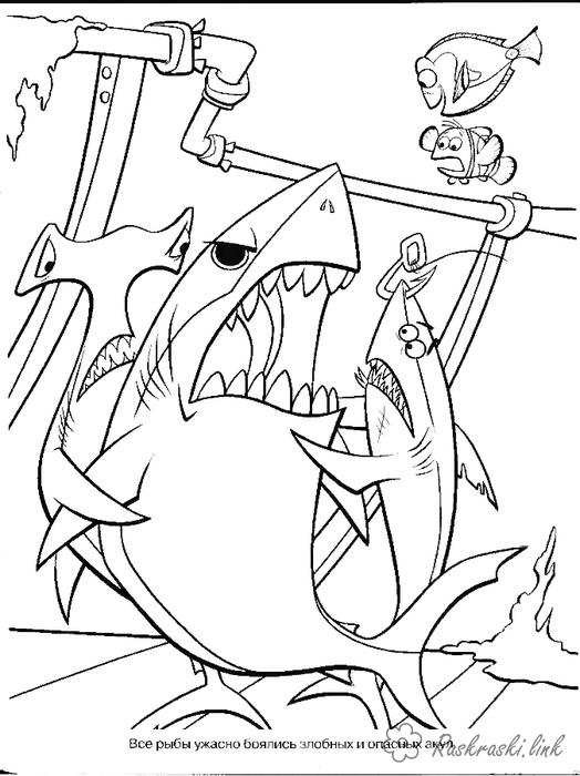 Розлючена акула і Немо. Раскраска розмальовки мультфільми, розмальовки в пошуках немо, Немо, риба, акула завантажити бесплатно онлайн