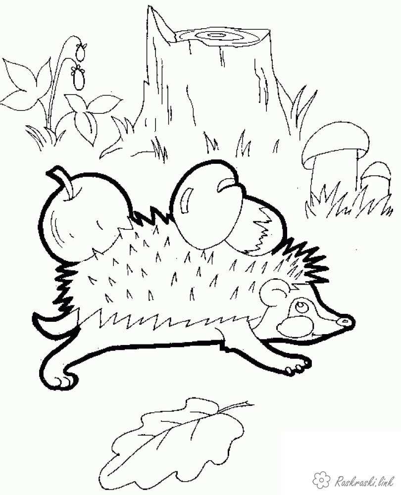 Розмальовка їжачок в лісі несе яблуко і гриб. Раскраска Розмальовка тварини, дикі тварини, розфарбування їжачок, їжак, яблуко, гриб, ліс, їжачок у лісі, їжак, голки завантажити бесплатно онлайн