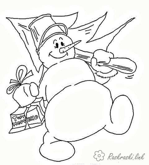 веселий сніговик несе в подарунок ялинку. Раскраска розмальовки дітям, чорно-білі картинки, новий рік, свято, зима, сніговик, ялинка, подарунки завантажити бесплатно онлайн