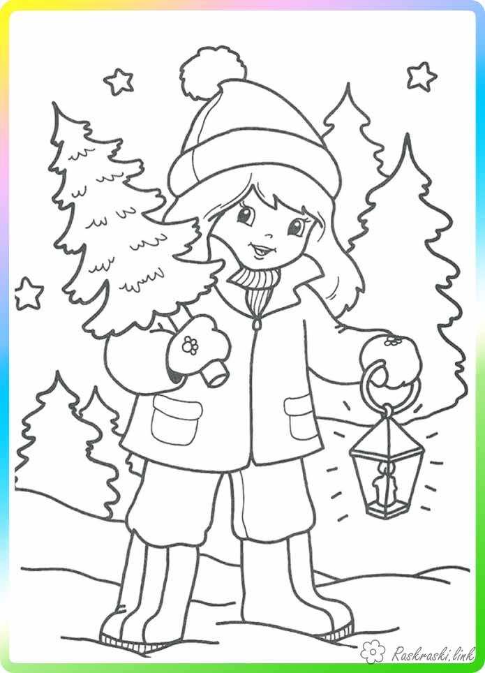 маленька дівчинка несе ялиночку додому. Раскраска розмальовки дітям, чорно-білі картинки, новий рік, свято, зима, дівчинка, ялинка, ліхтарик завантажити бесплатно онлайн