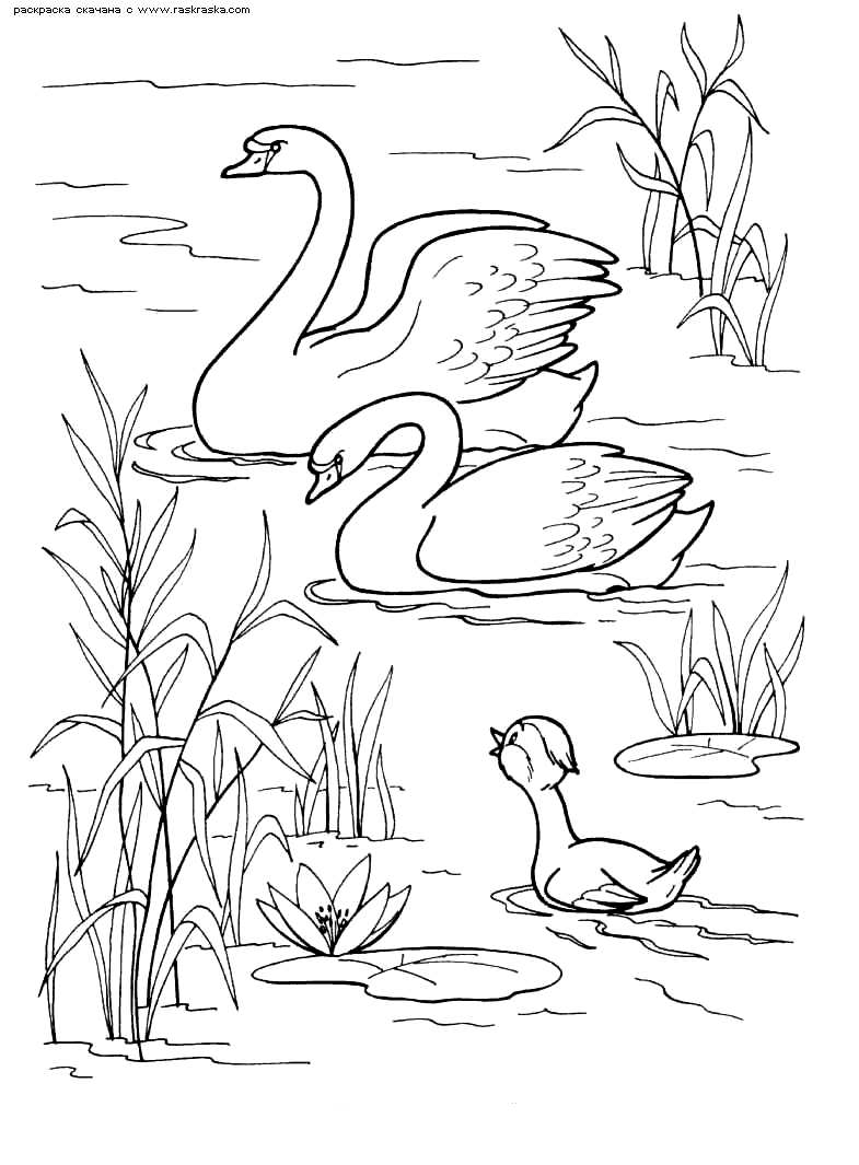лебеді на озері. Раскраска природа лісові тварини птиці лебеді озеро завантажити бесплатно онлайн