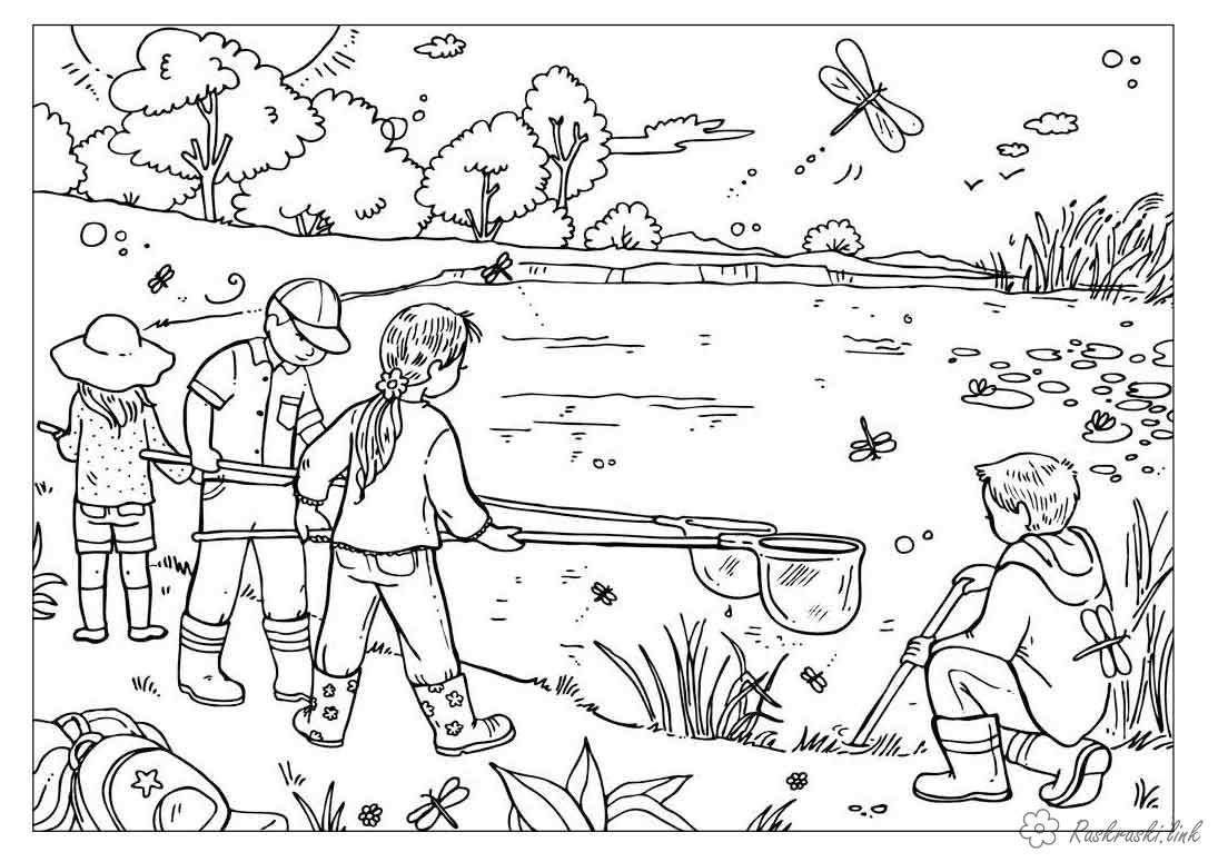 Діти на природі. Раскраска Дитячі розмальовки, природа, відпочинок, відпочинок на природі, діти, озеро, комахи завантажити бесплатно онлайн