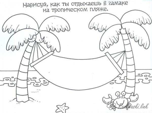 Дорисуй себе в гамаку. Раскраска домалюй і розфарбуй, домалюй себе, відпочинок, природа, острів, пальми завантажити бесплатно онлайн