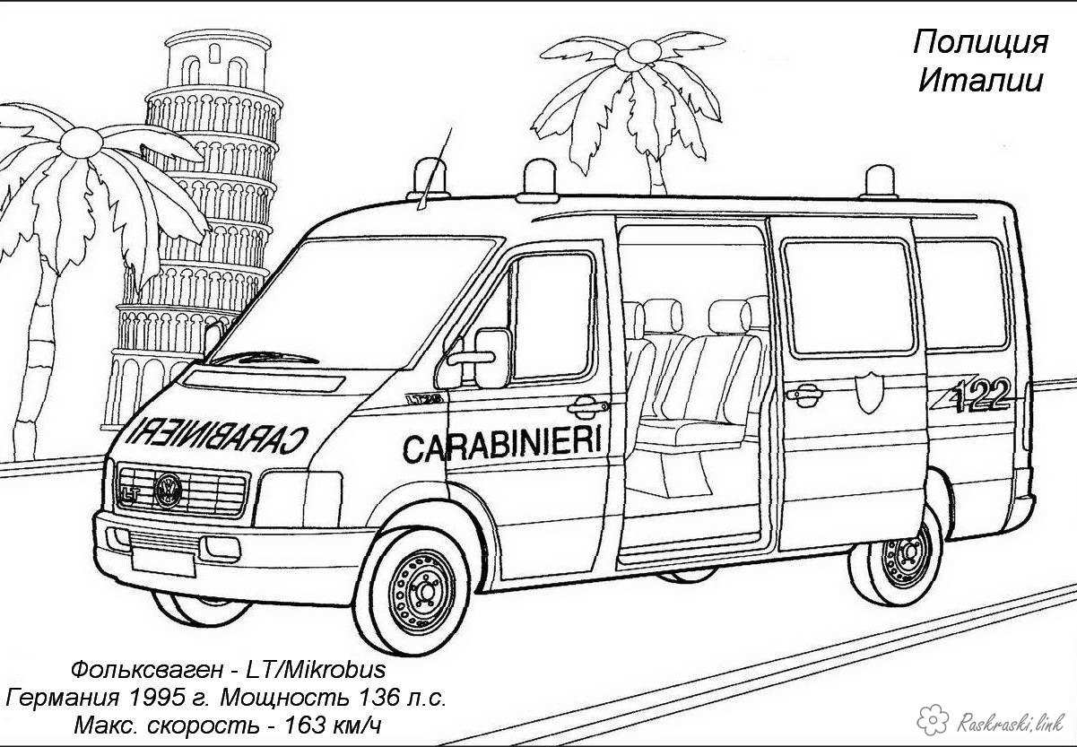 Розмальовка "Машини Поліції". Раскраска розфарбування машини поліції Італії завантажити бесплатно онлайн