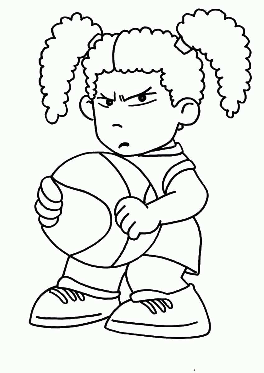 похмура дівчинка і баскетбольний м'яч. Раскраска дівчинка, похмура, м'яч, спорт завантажити бесплатно онлайн