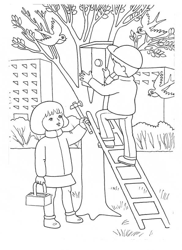 дети прибивают скворечник. Раскраска дети устанавливают скворечник на дерево, весна, раскраска, девочка и мальчик завантажити бесплатно онлайн