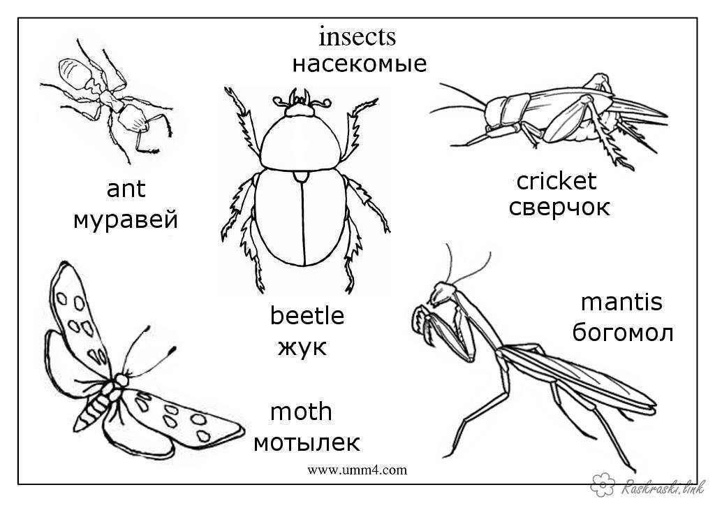 Раскраска с описанием, насекомые. Раскраска богомол, мотылек, жук, муравей, сверчок, насекомые, детские раскраски завантажити бесплатно онлайн