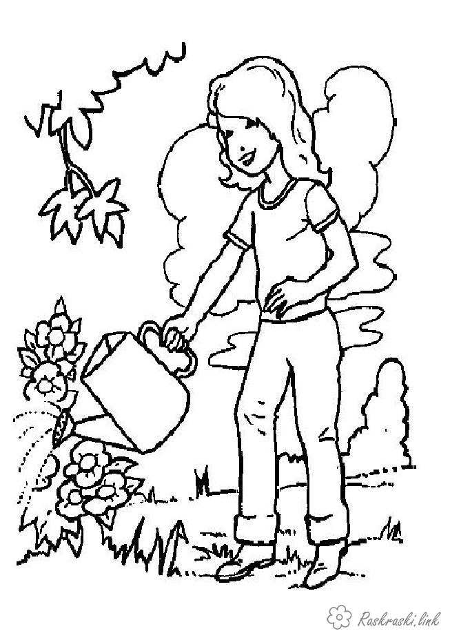 Дівчинка поливає квіти. Раскраска розмальовки рослини, природа, дівчинка, квіти завантажити бесплатно онлайн