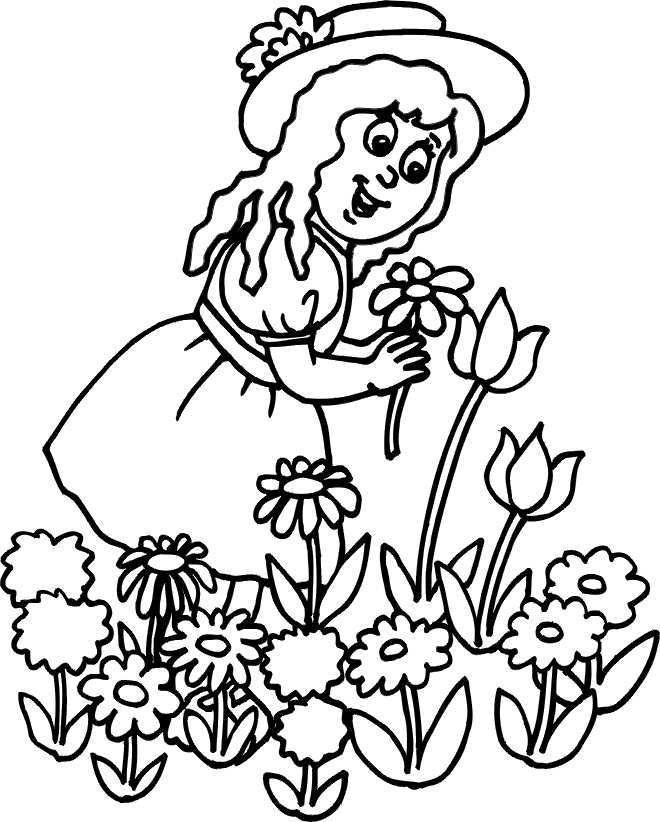 Дівчинка збирає квіти. Раскраска дівчинка, квіти, літо, збирати завантажити бесплатно онлайн
