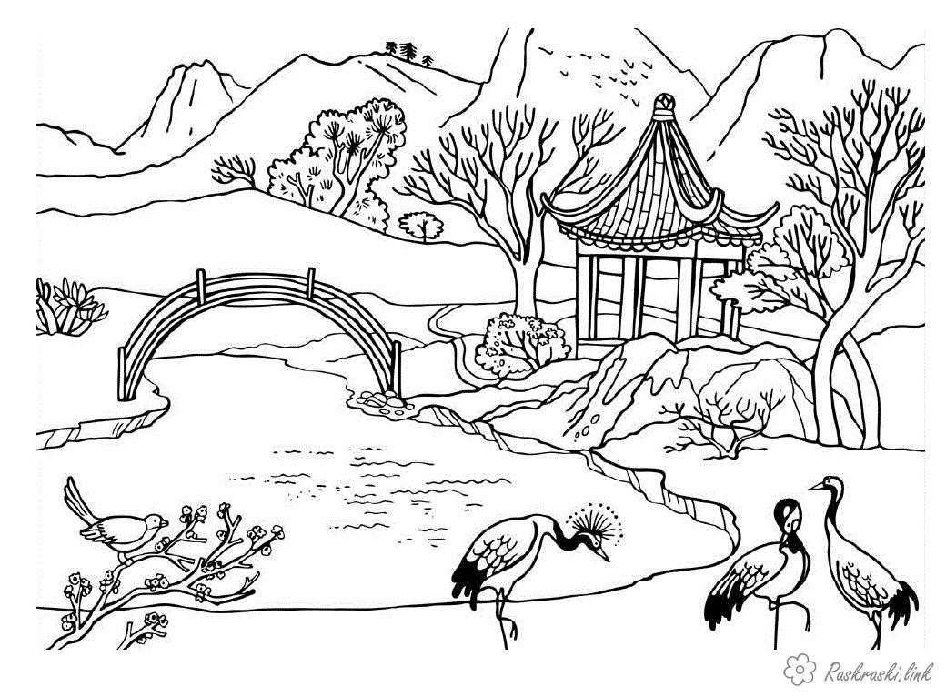 Природа в Китаї. Раскраска розмальовки для дітей, природа, відпочинок на природі, Китай, птиці, річка, міст, храм, будівля, будинок, архітектура завантажити бесплатно онлайн
