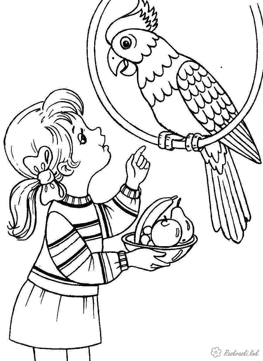 Дівчинка і папуга. Раскраска Дівчатка, дівчинка, папуга, тварина, птиця завантажити бесплатно онлайн