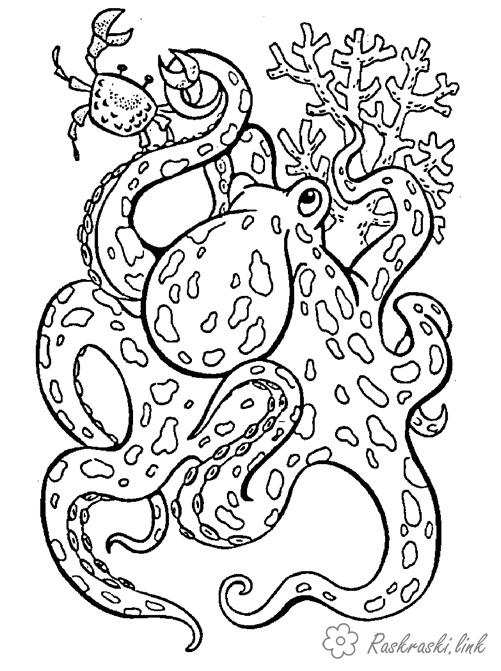 Розмальовка восьминіг зловив краба. Раскраска Краб, восьминіг, корали завантажити бесплатно онлайн