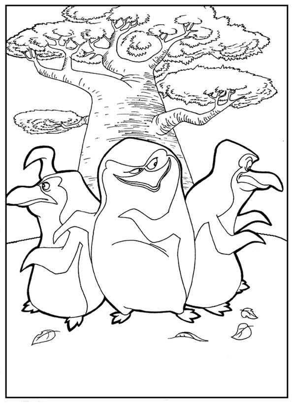 Пінгвіни близько дерева. Раскраска розмальовки мультфільми, розмальовки Пінгвіни Мадагаскару, пінгвіни завантажити бесплатно онлайн