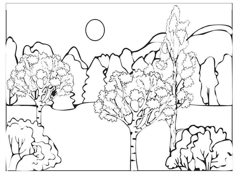 Красивый пейзаж. Раскраска Детские раскраски, природа, отдых, отдых на природе, лес, горы, деревья завантажити бесплатно онлайн