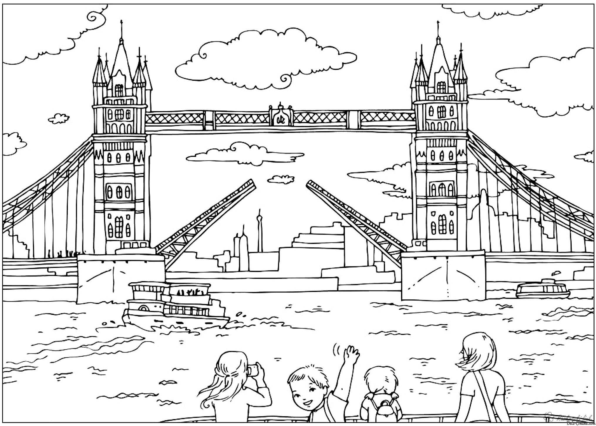 Розмальовка для дітей "Подорож в Лондон". Раскраска Дитяча розфарбування подорож в Лондон, міст над Темзою завантажити бесплатно онлайн