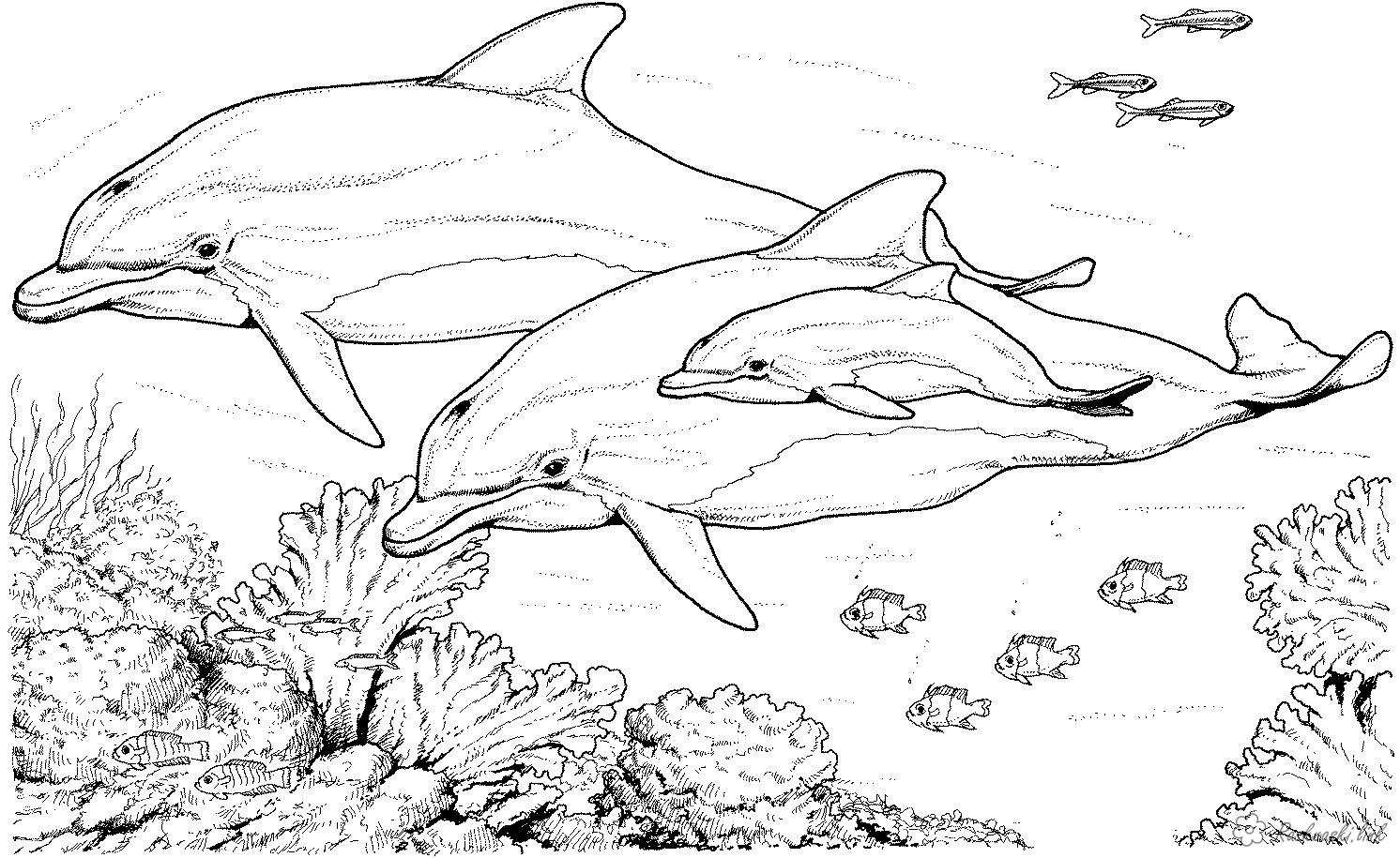 Розмальовка дельфіни. Раскраска Підводний світ, дельфіни, риби завантажити бесплатно онлайн