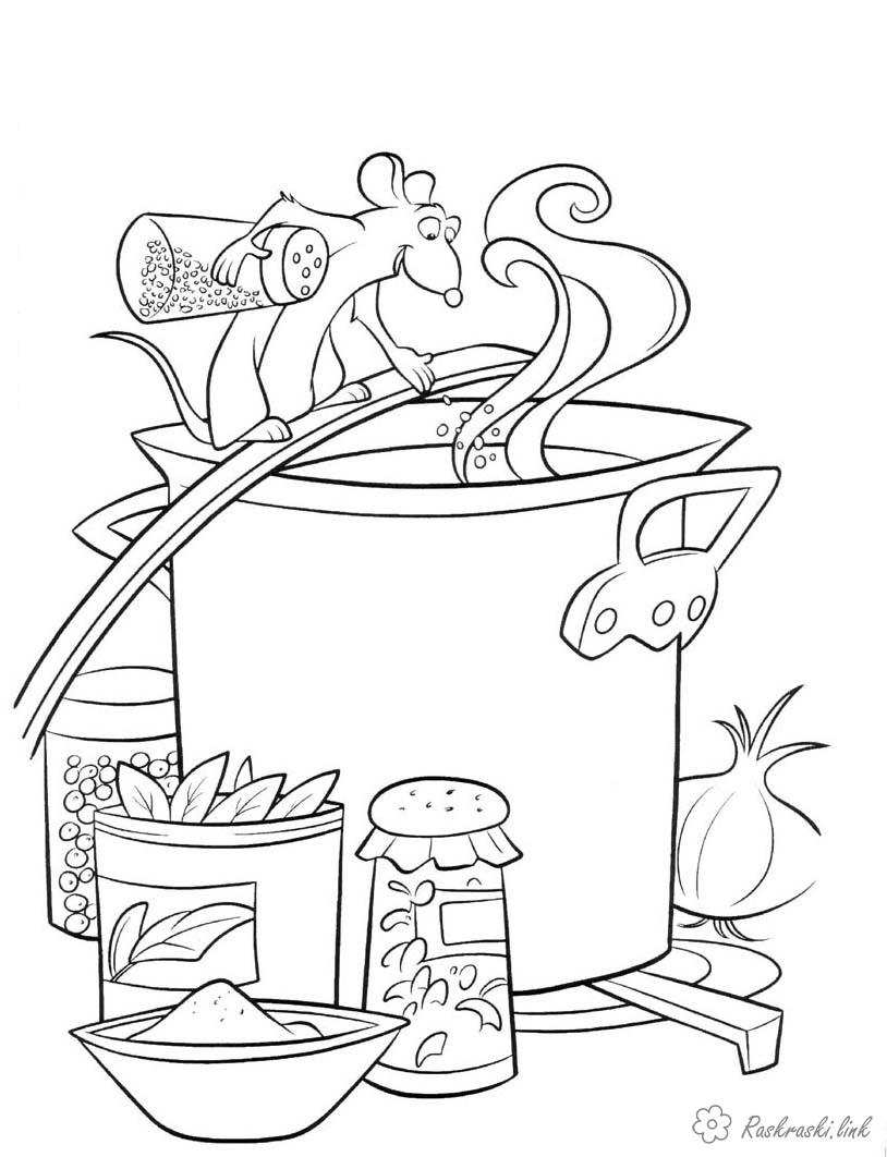 Розмальовка щур Ремі готує. Раскраска Рататуй, щур, Ремі, кухар, каструля, спеції завантажити бесплатно онлайн