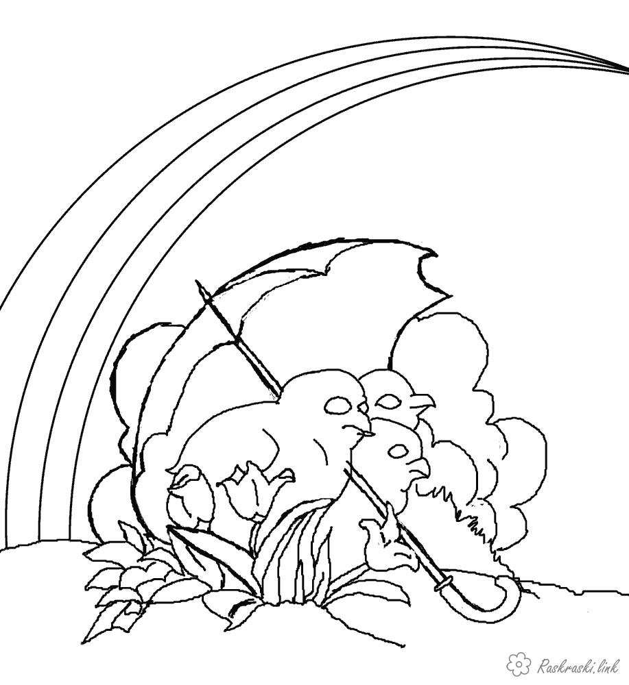 Розмальовка веселка над пташенятами. Раскраска Явища природи, веселка, пташенята, парасольку завантажити бесплатно онлайн