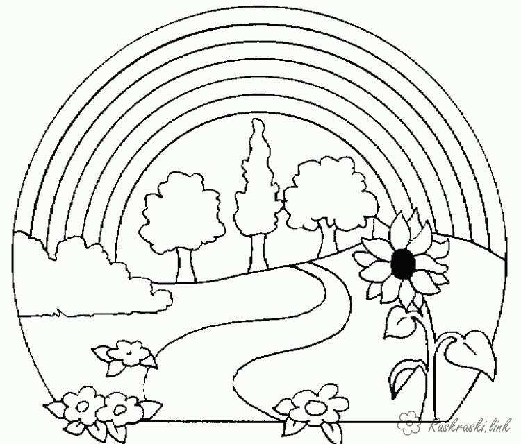 Дерева і веселка. Раскраска розмальовки для дітей, природа, відпочинок на природі, дерева, веселка, річка завантажити бесплатно онлайн