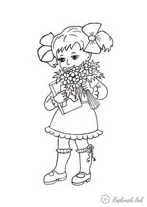 Дівчинка з книгою і квітами. Раскраска Розмальовки свята, розмальовки 1 червня, дівчинка завантажити бесплатно онлайн