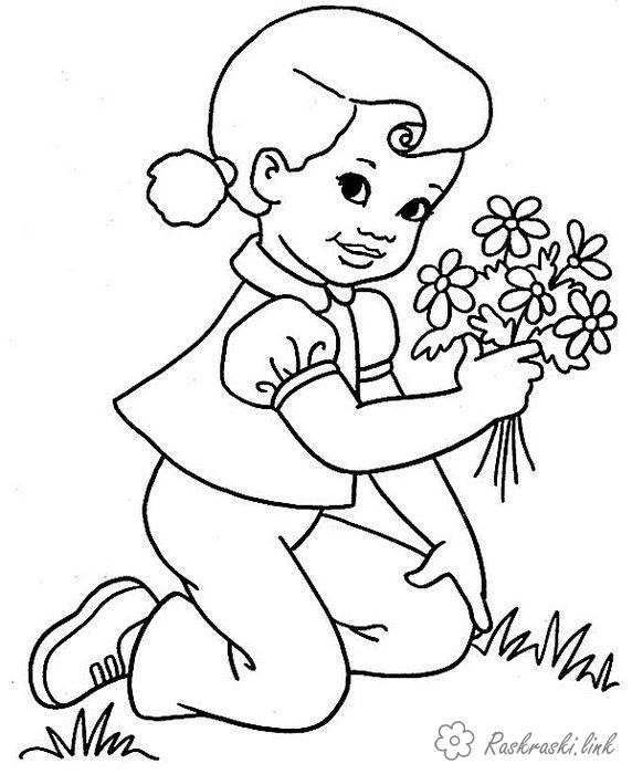 Дівчинка з квітами. Раскраска Свято 1 червня День захисту дітей дівчинка квіти завантажити бесплатно онлайн