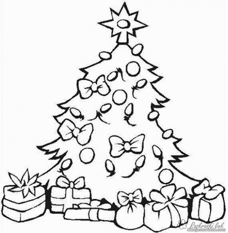 новорічна ялинка з подарунками. Раскраска розмальовки дітям, чорно-білі картинки, новий рік, свято, зима, ялинка завантажити бесплатно онлайн