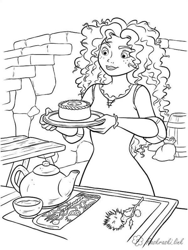 Мерида с тортом. Раскраска розмальовки хоробра серцем, розмальовки мультфільми, Меріда, дівчина завантажити бесплатно онлайн