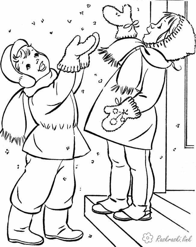 Діти радіють снігу. Раскраска розмальовки для дітей, явища природи, природа, сніг, діти, хлопчик, дівчинка завантажити бесплатно онлайн