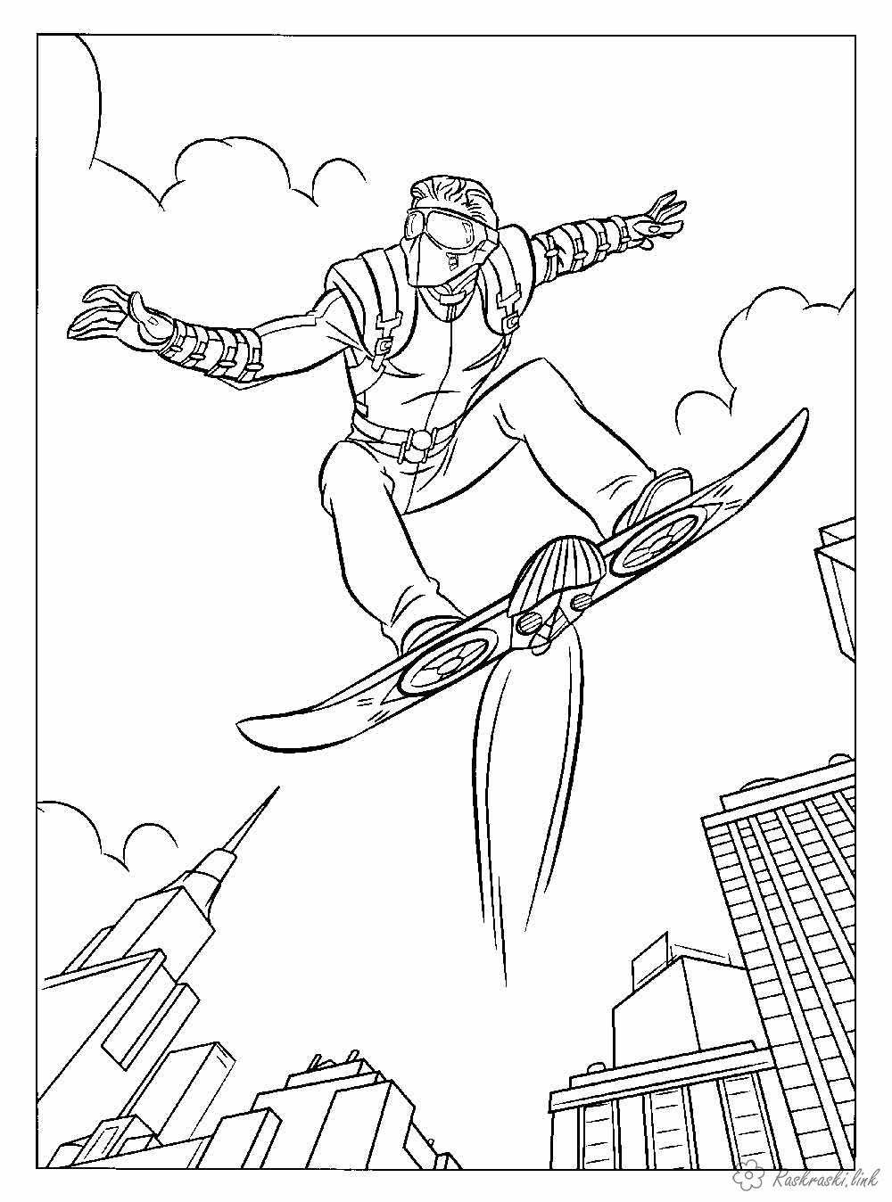 Супергерой на сноуборді. Раскраска Розмальовки для дітей, супергерої, дя хлопчиків завантажити бесплатно онлайн