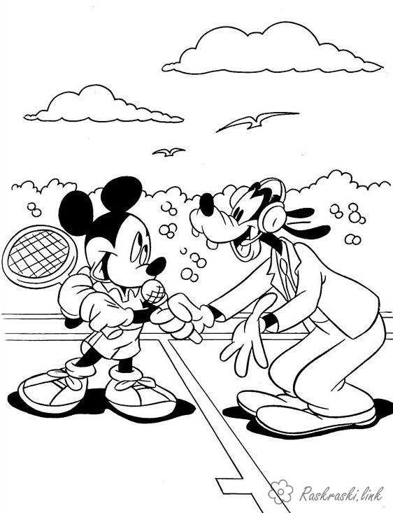 Міккі Маус і Гуффі грають у теніс. Раскраска Міккі Маус, Гуфі, теніс, спортивний завантажити бесплатно онлайн