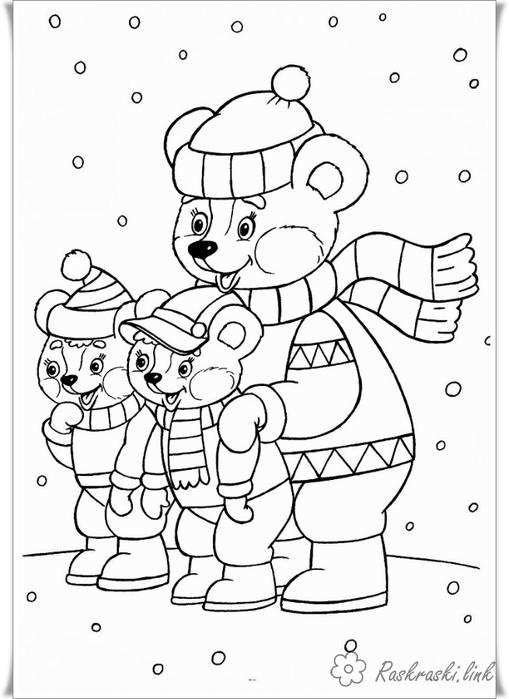 трьох ведмежати зустрічають новий рік. Раскраска розмальовки дітям, чорно-білі картинки, новий рік, свято, зима, ведмежа, ведмедиця, шарфик завантажити бесплатно онлайн