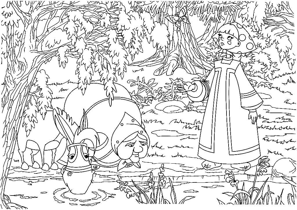 Любава с Бабкой и Моисеем. Раскраска раскраски, Алеша Попович и Тугарин Змей, Любава, Моисей, ослик, осел завантажити бесплатно онлайн