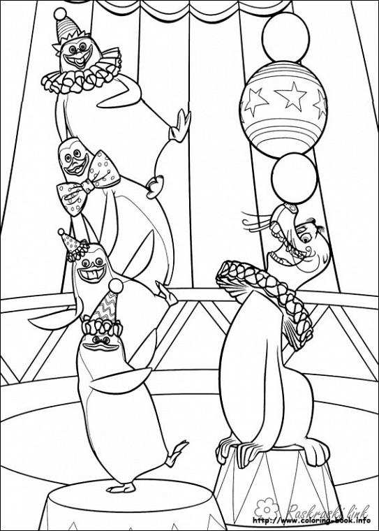Пінгвіни і тюлень в цирку. Раскраска розмальовки мультфільми, розмальовки Пінгвіни Мадагаскару, пінгвіни, тюлень завантажити бесплатно онлайн