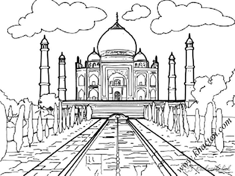 Тадж-Махал в-Агрі, Індія. Раскраска розмальовки для дітей, подорожі, азія, Індія, храм завантажити бесплатно онлайн