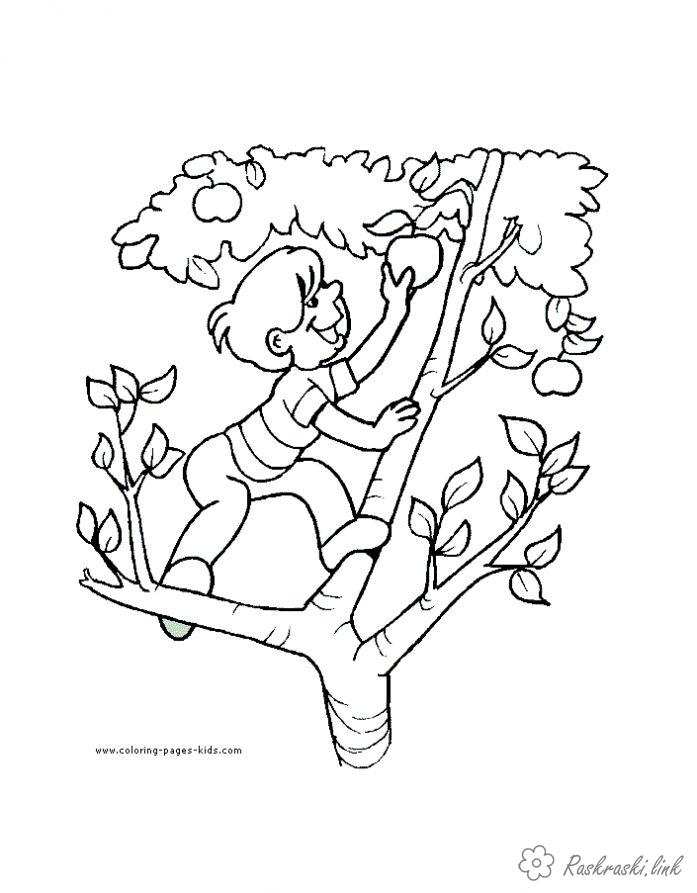 розмальовка дерево яблуня. Раскраска розфарбування яблунька, хлопчик рве яблучка, природа завантажити бесплатно онлайн