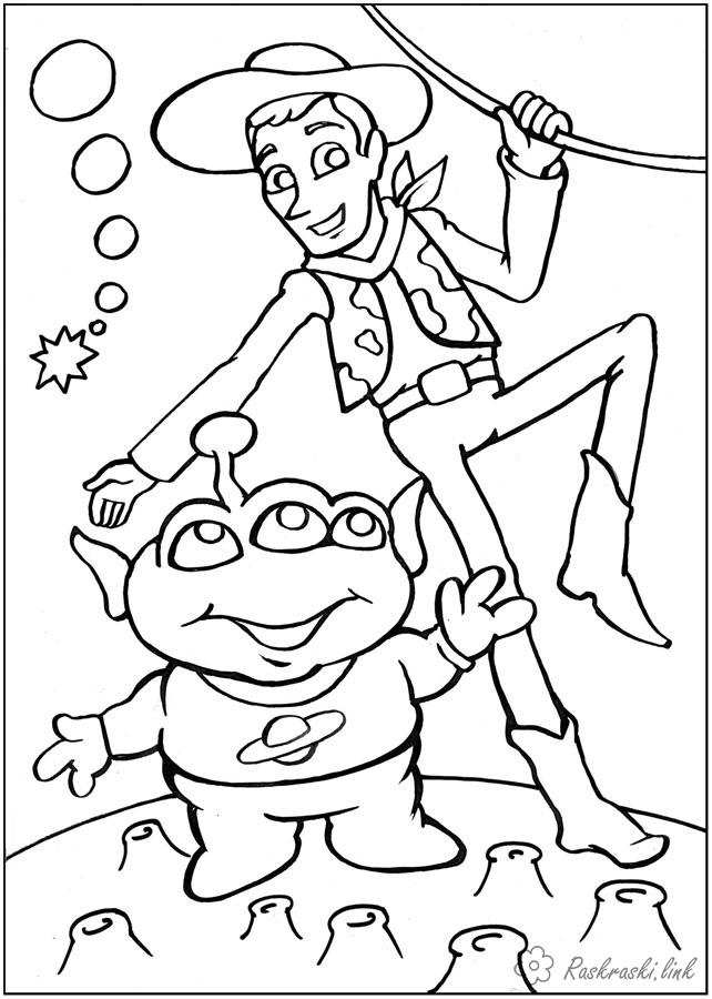 Розмальовка ковбой Вуді та інопланетянин. Раскраска Історія іграшок, ковбой, Вуді, інопланетянин, місяць, космос завантажити бесплатно онлайн